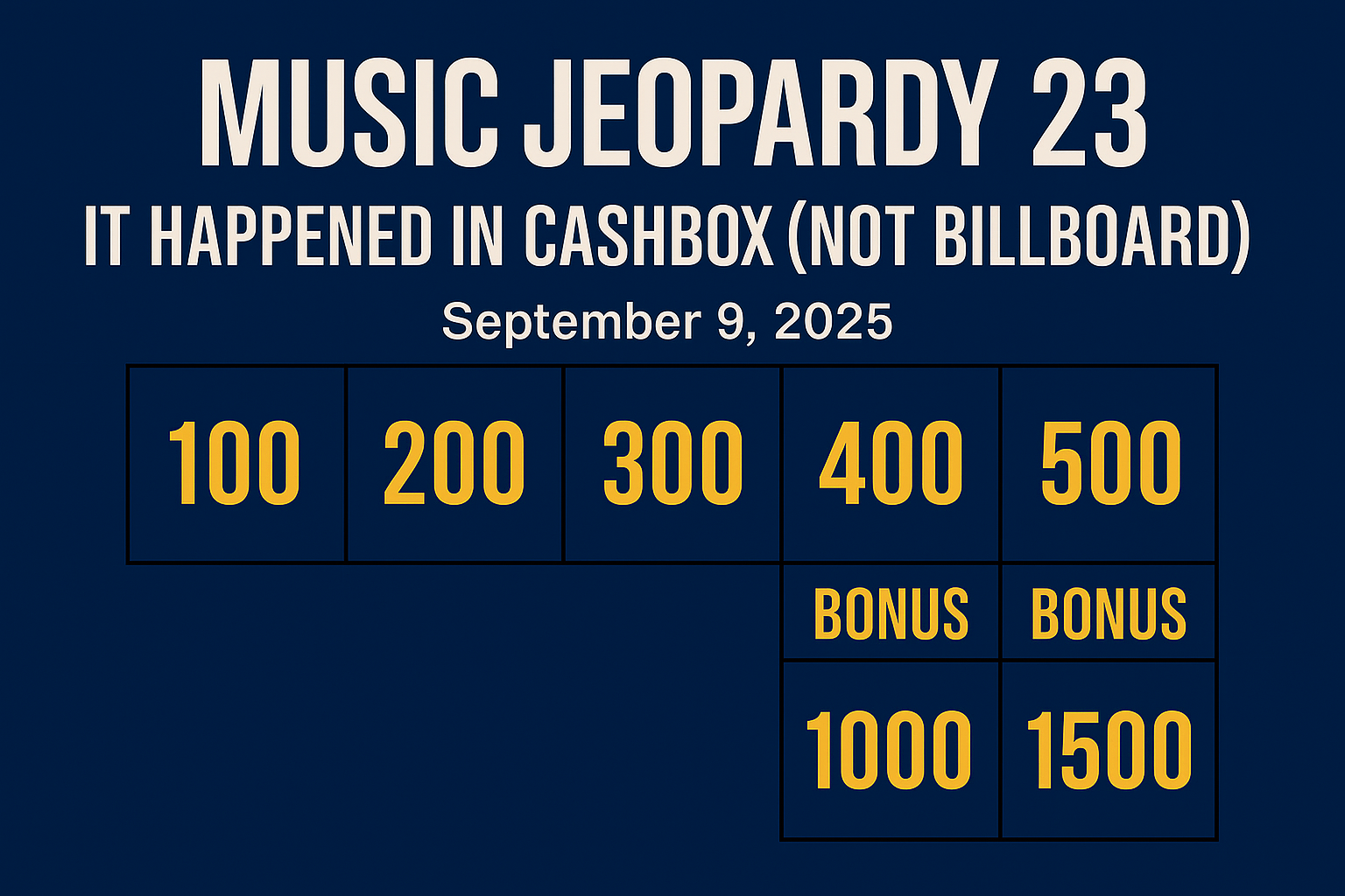 (September 9, 2025) – Welcome to the 23rd edition of Music Jeopardy! As always, the blog provides the clues… and you provide the responses. And every clue now comes with a point value — no dollars! The player(s) with the most points get bragging rights.