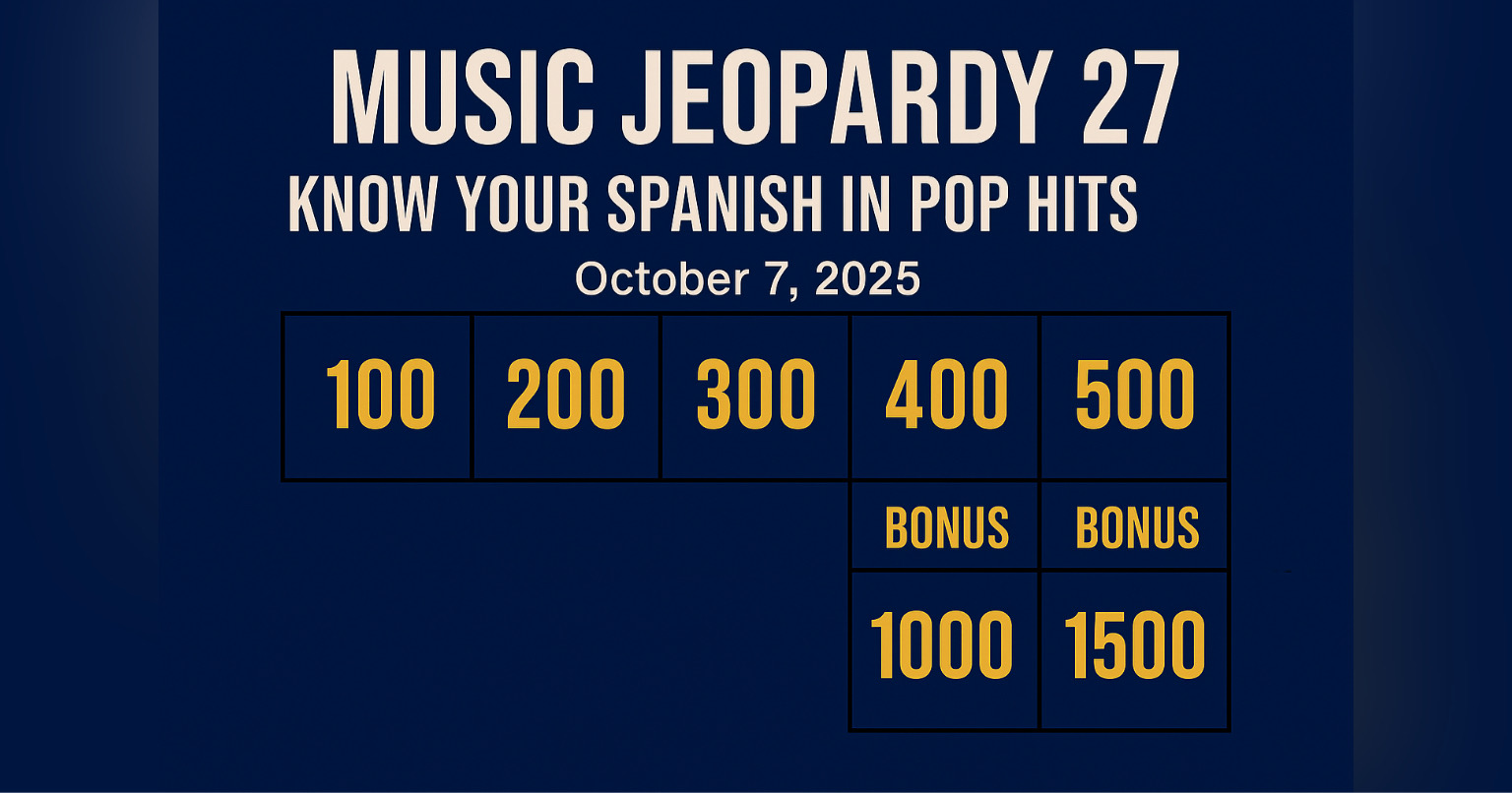 (October 7, 2025) – Welcome to the 27th edition of Music Jeopardy! As always, the blog provides the clues… and you provide the responses. Each clue has point values — no dollars! The player(s) with the most points gets bragging rights.