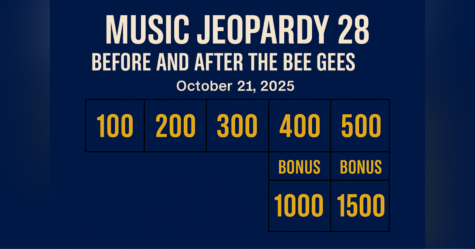(October 21, 2025) – Welcome to the 28th edition of Music Jeopardy! As always, the blog provides the clues… and you provide the responses. Each clue has point values — no dollars! The player(s) with the most points gets bragging rights.