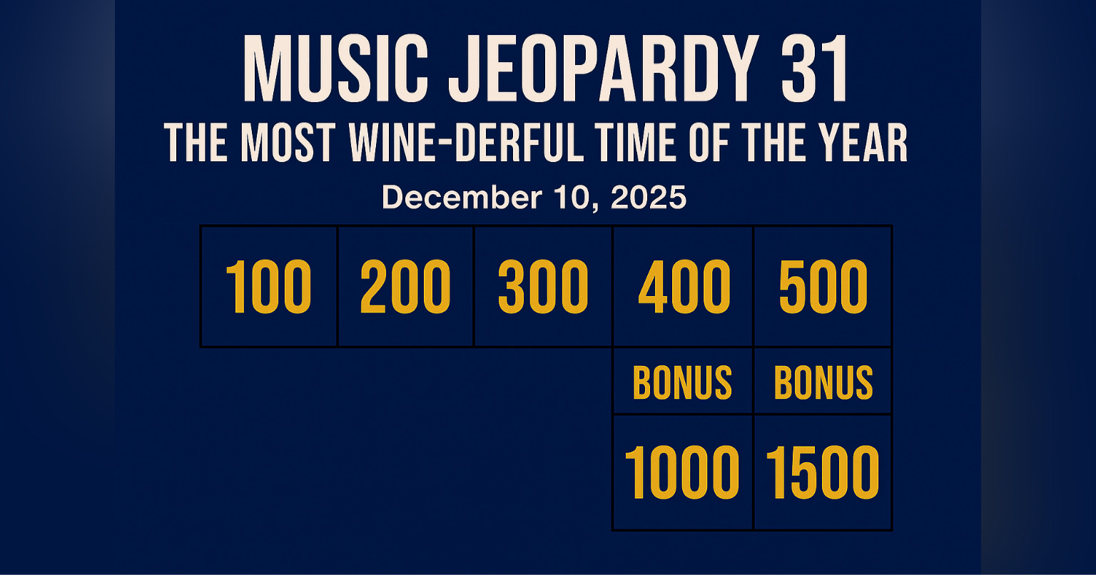 (December 10, 2025) – Welcome to the 31st edition of Music Jeopardy! As always, the blog provides the clues… and you provide the responses. Each clue has point values — no dollars! The player(s) with the most points gets bragging rights.