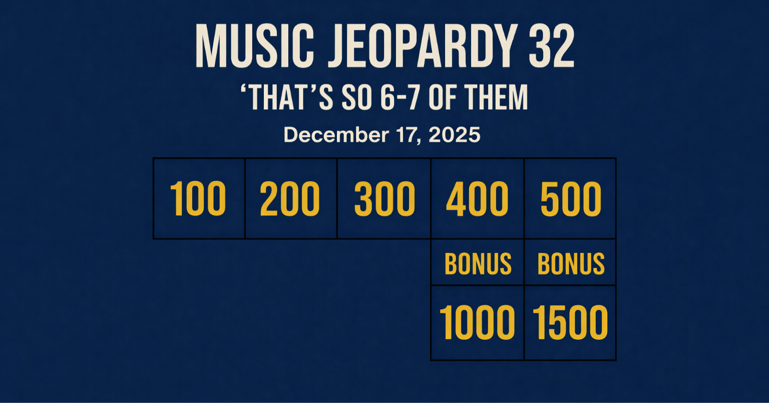 (December 17, 2025) – Welcome to the 32nd edition of Music Jeopardy!  As always, the blog provides the clues… and you provide the responses.  Each clue has point values — no dollars!  The player(s) with the most points gets bragging rights.