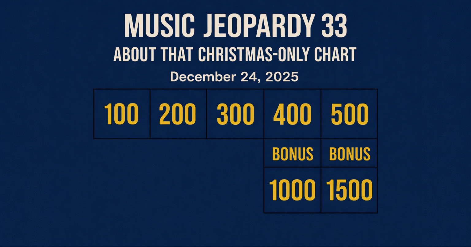 December 24, 2025) – Welcome to the 33rd edition of Music Jeopardy! As always, the blog provides the clues… and you provide the responses. Each clue has point values — no dollars! The player(s) with the most points gets bragging rights.