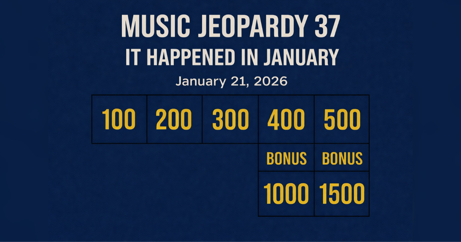 (January 21, 2026) – Welcome to Music Jeopardy 37! It’s the weekly music challenge where the blog provides the clues… and you provide the responses. Each clue has point values — no dollars! The player(s) with the most points gets bragging rights.