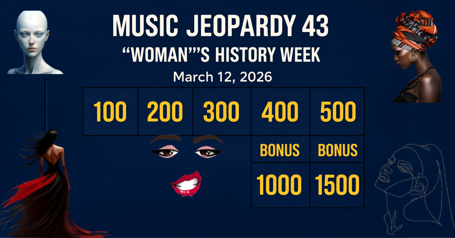 (March 12, 2026) – Welcome to Music Jeopardy 43! It’s the weekly music challenge where the blog provides the clues… and you provide the responses. Each clue has point values — no dollars! The player(s) with the most points gets bragging rights.