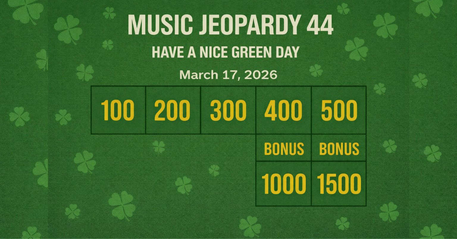 (March 17, 2026) – Happy St. Patrick’s Day and welcome to Music Jeopardy 44! It’s the weekly music challenge where the blog provides the clues… and you provide the responses. Each clue has point values — no dollars! The player(s) with the most points gets bragging rights.