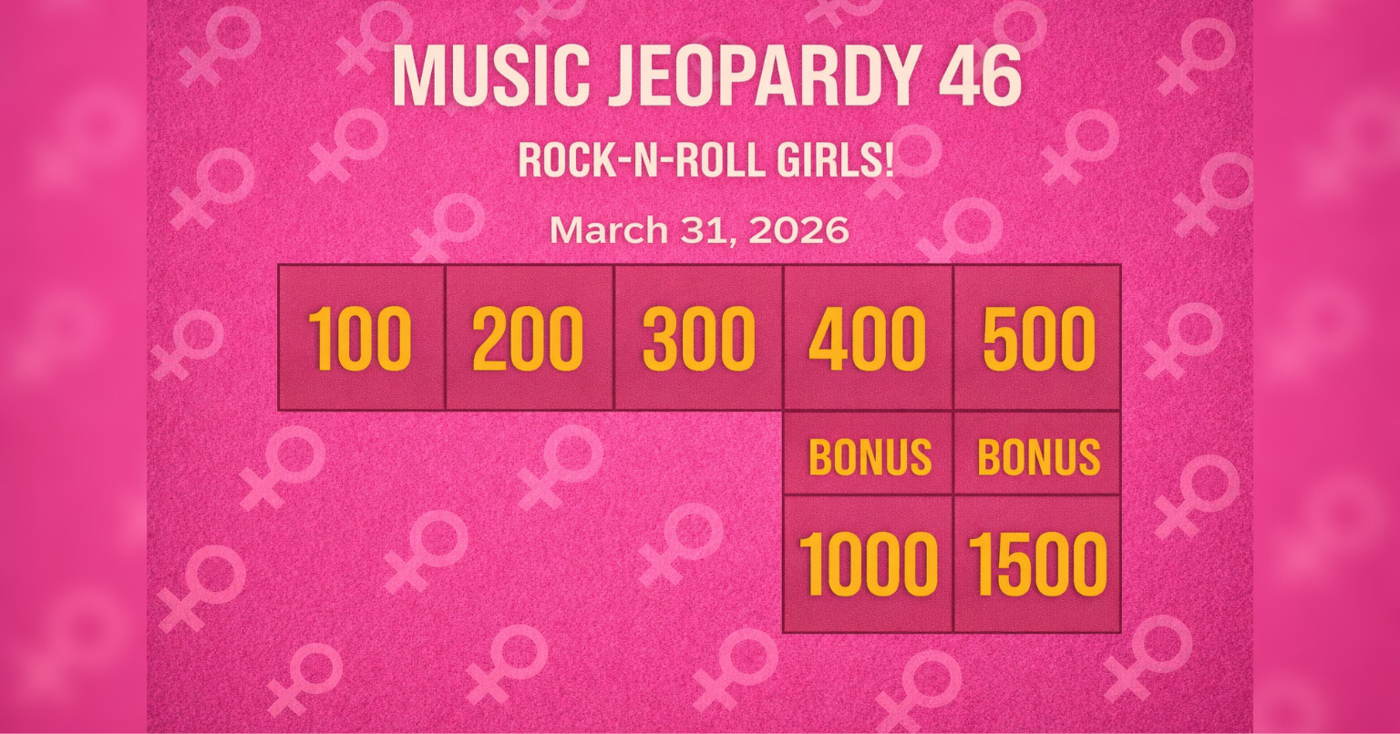 (March 31, 2026) – Welcome to Music Jeopardy 46! It’s the weekly music challenge where the blog provides the clues… and you provide the responses. Each clue has point values — no dollars! The player(s) with the most points gets bragging rights.