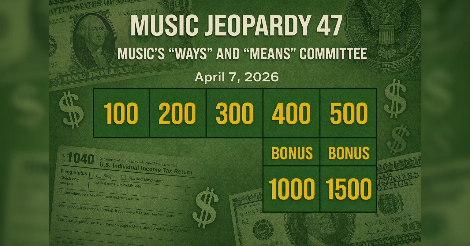 (April 7, 2026) – Welcome to Music Jeopardy 47! It’s the weekly music challenge where the blog provides the clues… and you provide the responses. Each clue has point values — no dollars! The player(s) with the most points gets bragging rights.