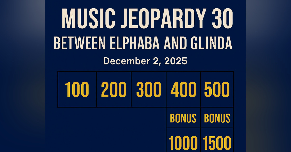 c5d084df63466d9a784d9c506840dee4 DJ Rob wrote a new post https://djrobblog.com/?p=23936 Tue, 02 Dec 2025 10:11:47 -0500 Music Jeopardy 30: Between Elphaba and Glinda: Name These Movie Songs That Fall Alphabetically Between Wicked’s Two Witches (December 2, 2025) – Welcome to the 30th edition of Music Jeopardy!  As always, the blog provides the clues… and you provide theRead More